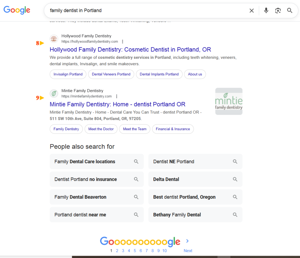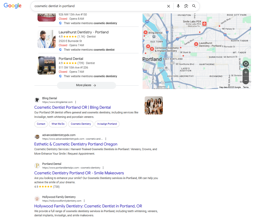 All key pages were optimized with focused keywords, metadata, and internal links. Local SEO strategies strengthened rankings for terms like “family dentist in Portland” and “cosmetic dentist in portland.”
